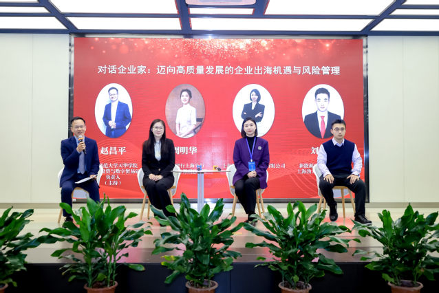 最后的“对话企业家”环节由上海师范大学天华学院“一带一路”投资与数字贸易研究中心负责人赵昌平主持。中国建设银行上海分行国际业务部副总经理周明华、上海智信多汽车科技有限公司董事长朱佳玲、上海劲力律师事务所律师刘江涛,围绕《迈向高质量发展的企业出海机遇与风险管理》这一主题,基于各自领域实践展开了深度对话。