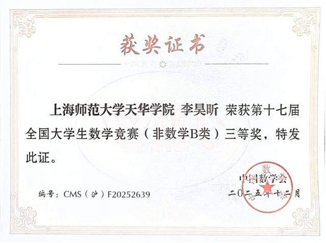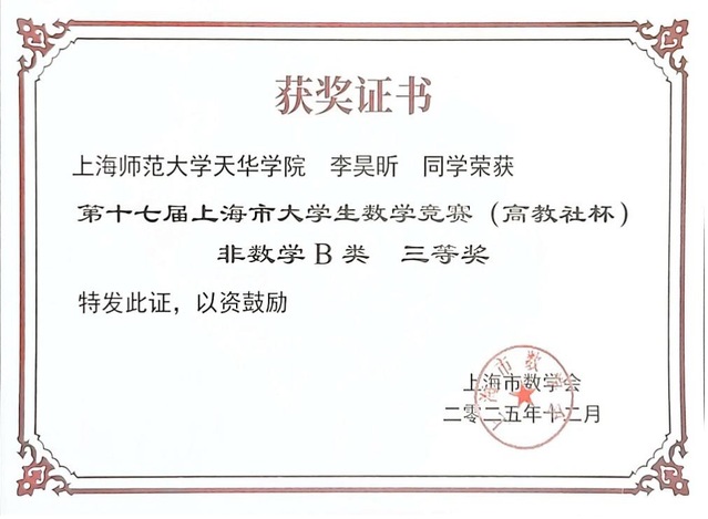 此次获奖是课程学习成果的集中体现。李昊昕同学在《数学分析》等专业课程中打下了扎实的理论基础。竞赛中的良好表现,既是个人刻苦钻研与教师悉心指导的共同成果,也充分体现了学校“为做人而学习”的育人理念对学生在知识掌握、能力提升与价值塑造方面的积极引领。期待此次成绩能激励更多学子在数学学习的道路上勇于探索、不断突破,为学院争光,为学校添彩。